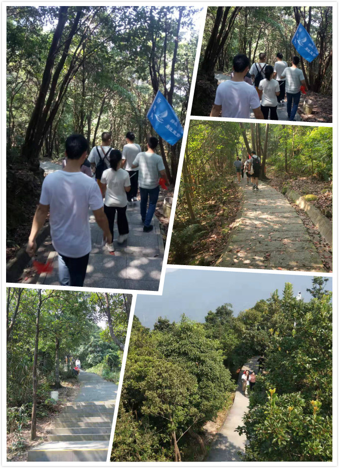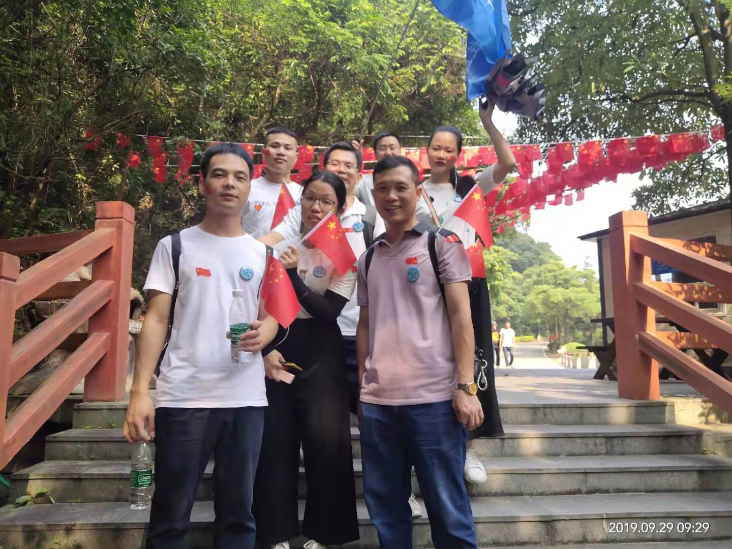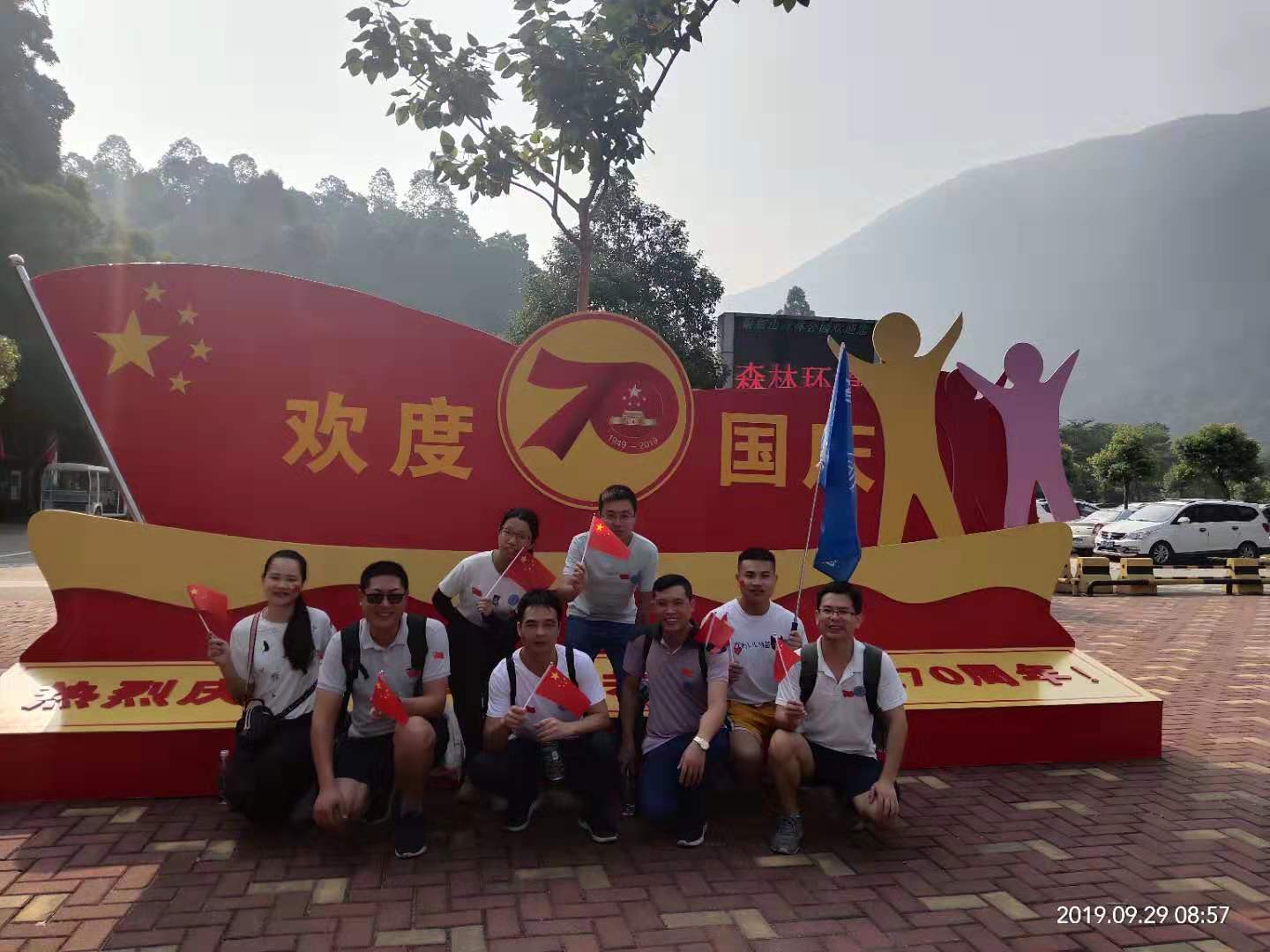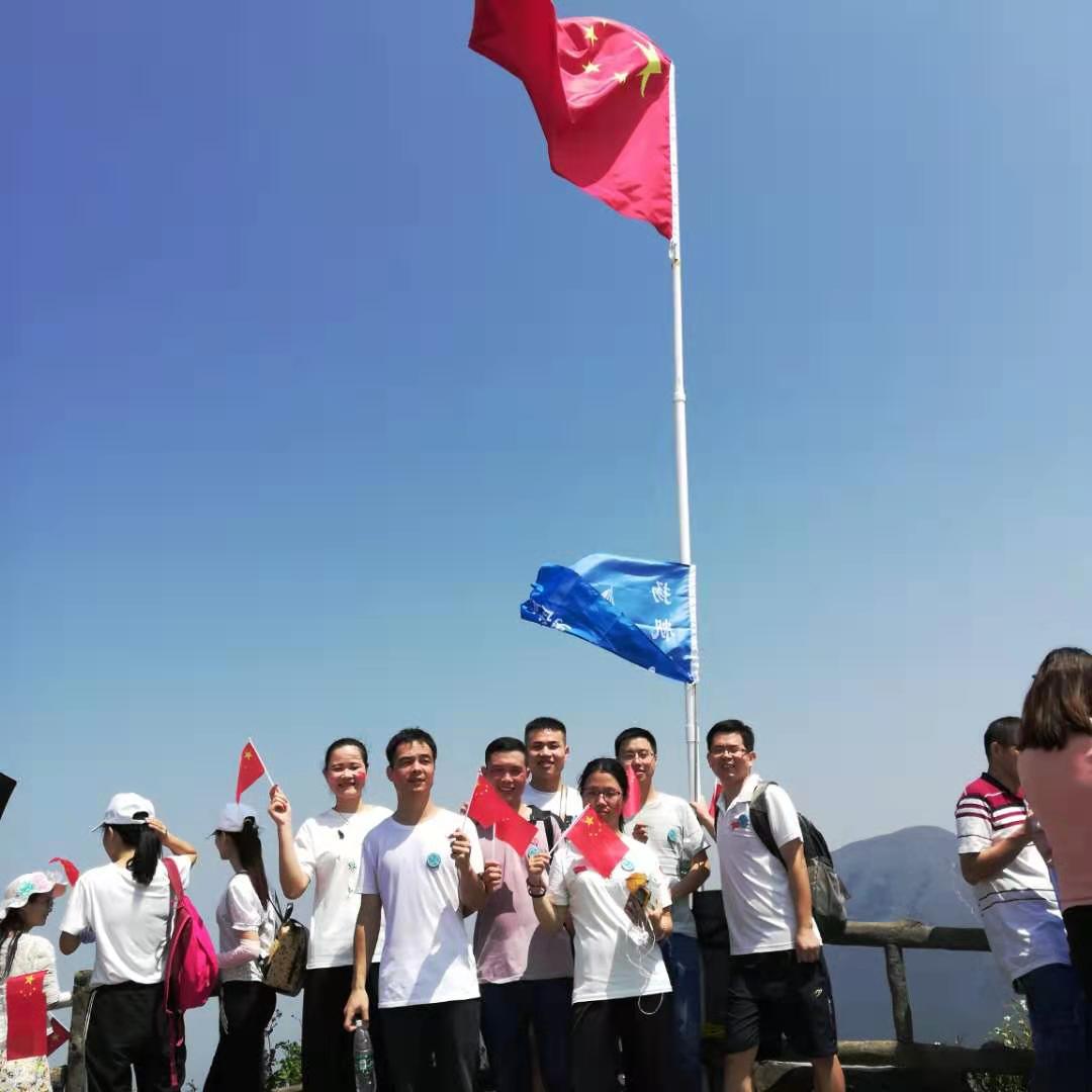 2019年9月29日,秋高气爽,随着祖国70周年华诞临近,我们满怀着期盼!在祖国更加强大的同时,我们也应加强自身,忆苦思甜,珍惜当前!我们众嘉扬帆TCC全体圈员进行首次户外活动---登银瓶山;清晨,大家早起并在厂区留影:每个人脸上洋溢着笑容,手举着五星红旗,带着圈旗合影留念,准备出发。