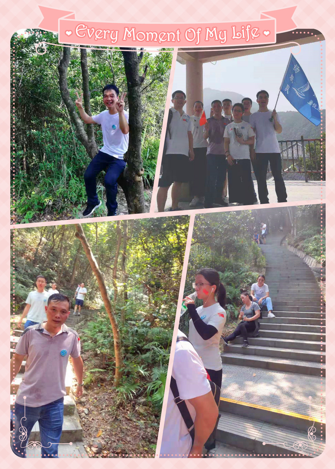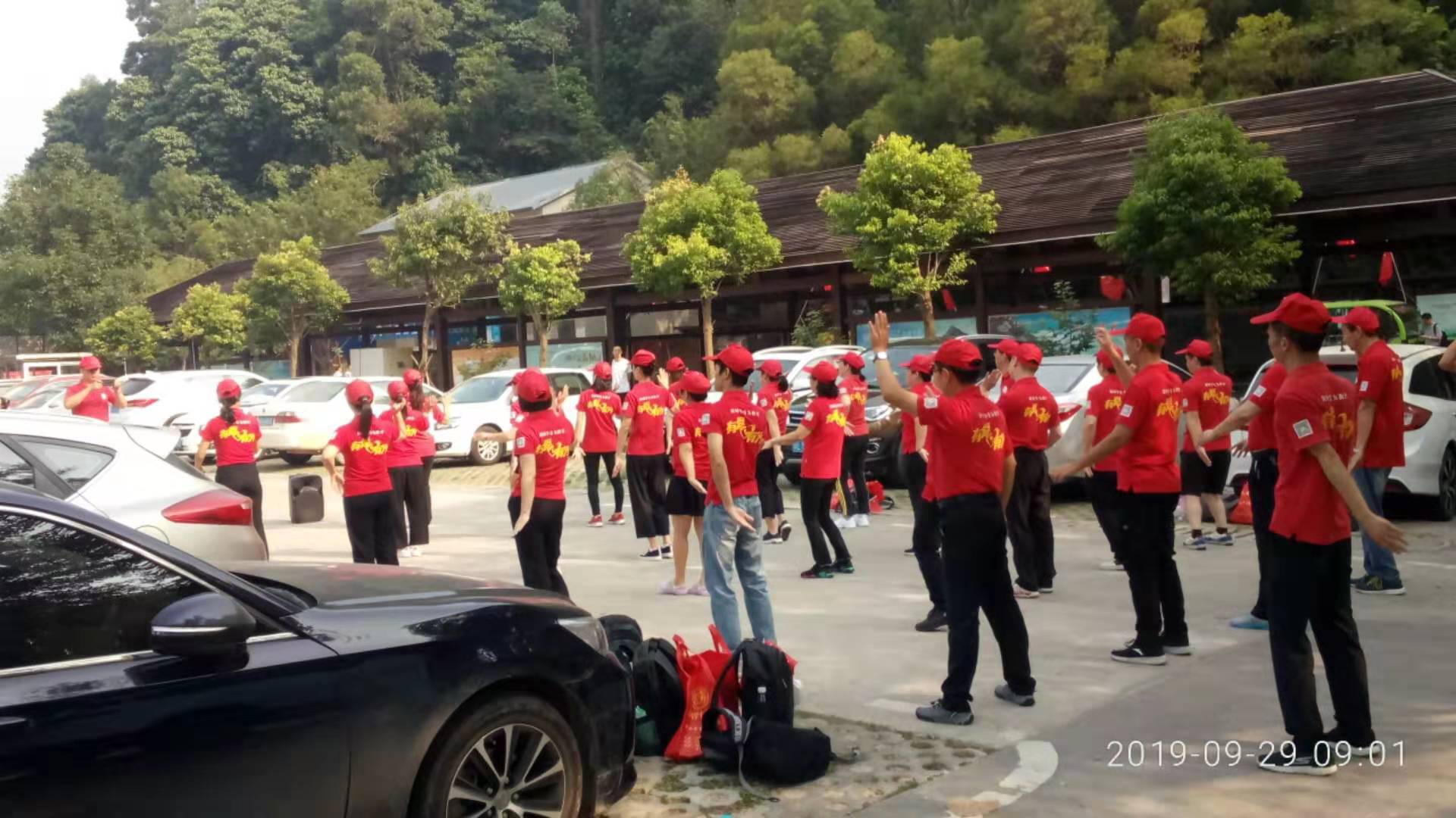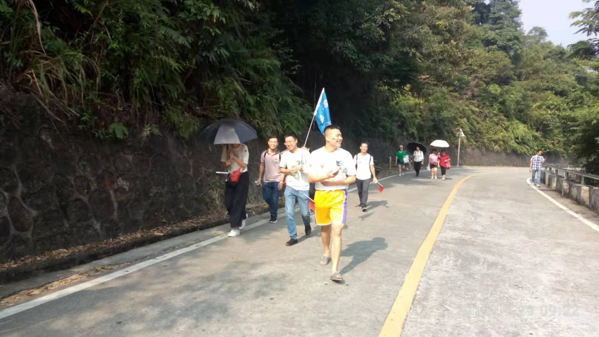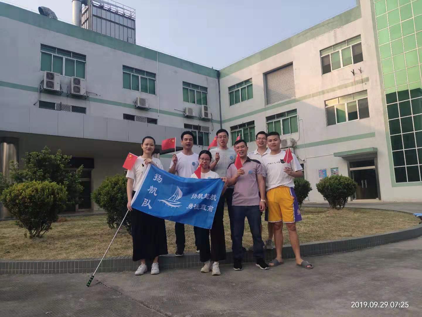2019年9月29日,秋高气爽,随着祖国70周年华诞临近,我们满怀着期盼!在祖国更加强大的同时,我们也应加强自身,忆苦思甜,珍惜当前!我们众嘉扬帆TCC全体圈员进行首次户外活动---登银瓶山;清晨,大家早起并在厂区留影:每个人脸上洋溢着笑容,手举着五星红旗,带着圈旗合影留念,准备出发。